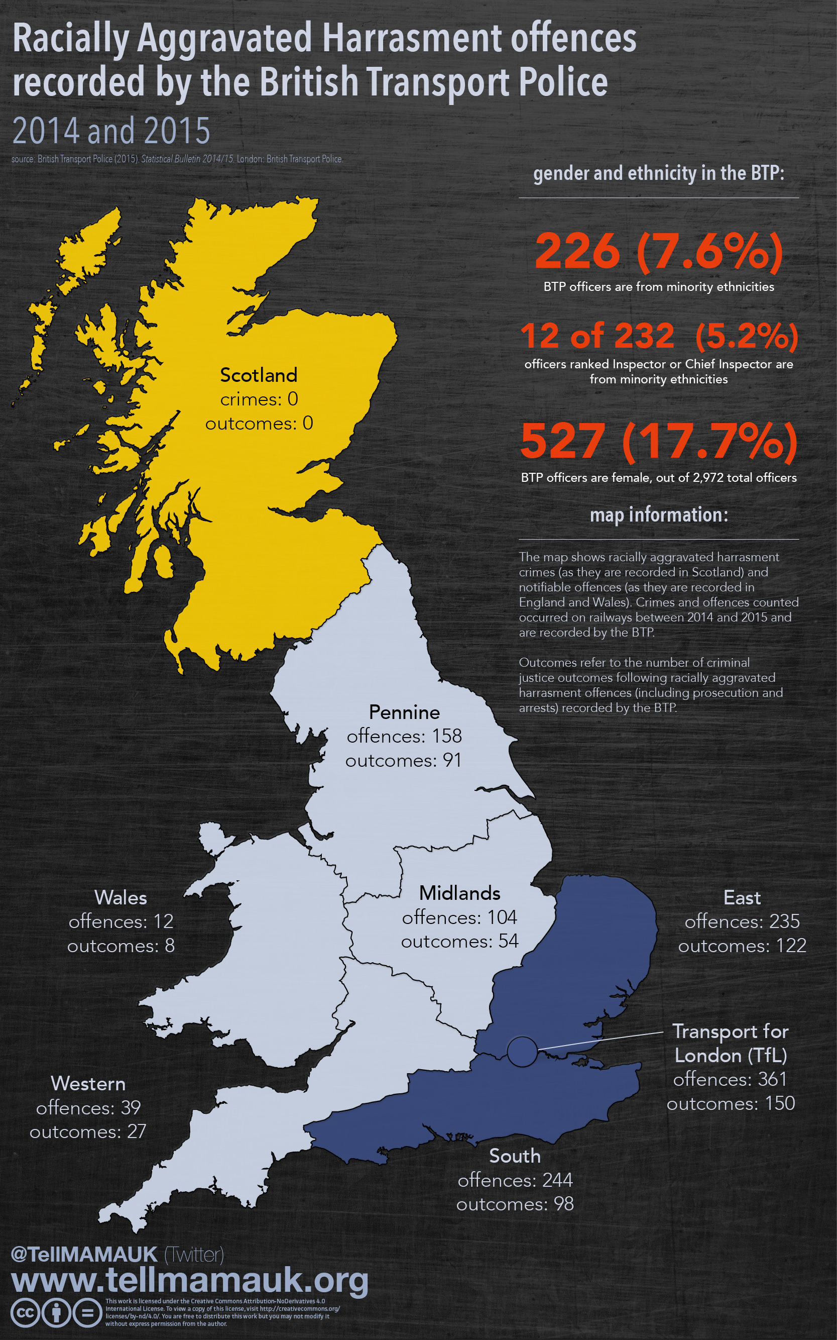 This is an infographic that we have put together on racially aggravated harassment offences recorded by the British Transport Police (BTP) in 2014 and 2015. BTP have been pro-active in responding to hate crimes on public transport and we are proud of our partnership with them.