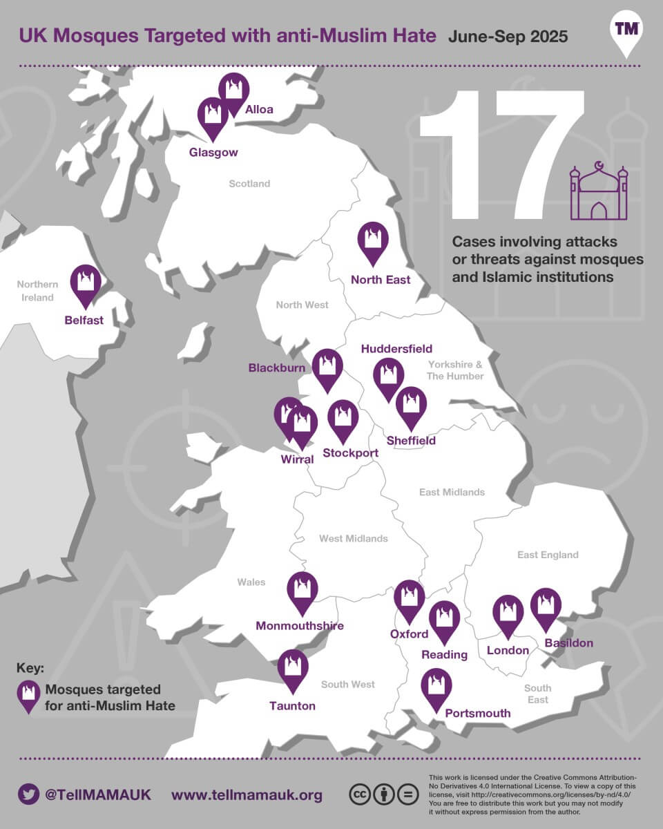 - 17 mosques and Islamic institutions have been targeted which we have mapped out in the previous graphic. This is deeply alarming since attacks on mosques and Islamic institutions send a much wider message to those who use the mosque, that they are not safe. It creates greater fears within communities who use the faith institutions.