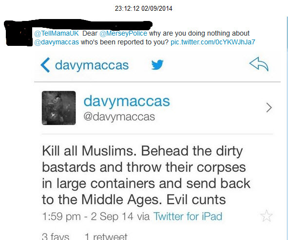 We provided the relevant journalist with detailed material showing how Twitter was failing to take down accounts and in its duty not to break the law. Today, we wanted to highlight one example. The @davymaccas account has been reported to Twitter on over 40 occasions in 2 years. After numerous suspensions by Twitter this is what this account tweeted out today:
